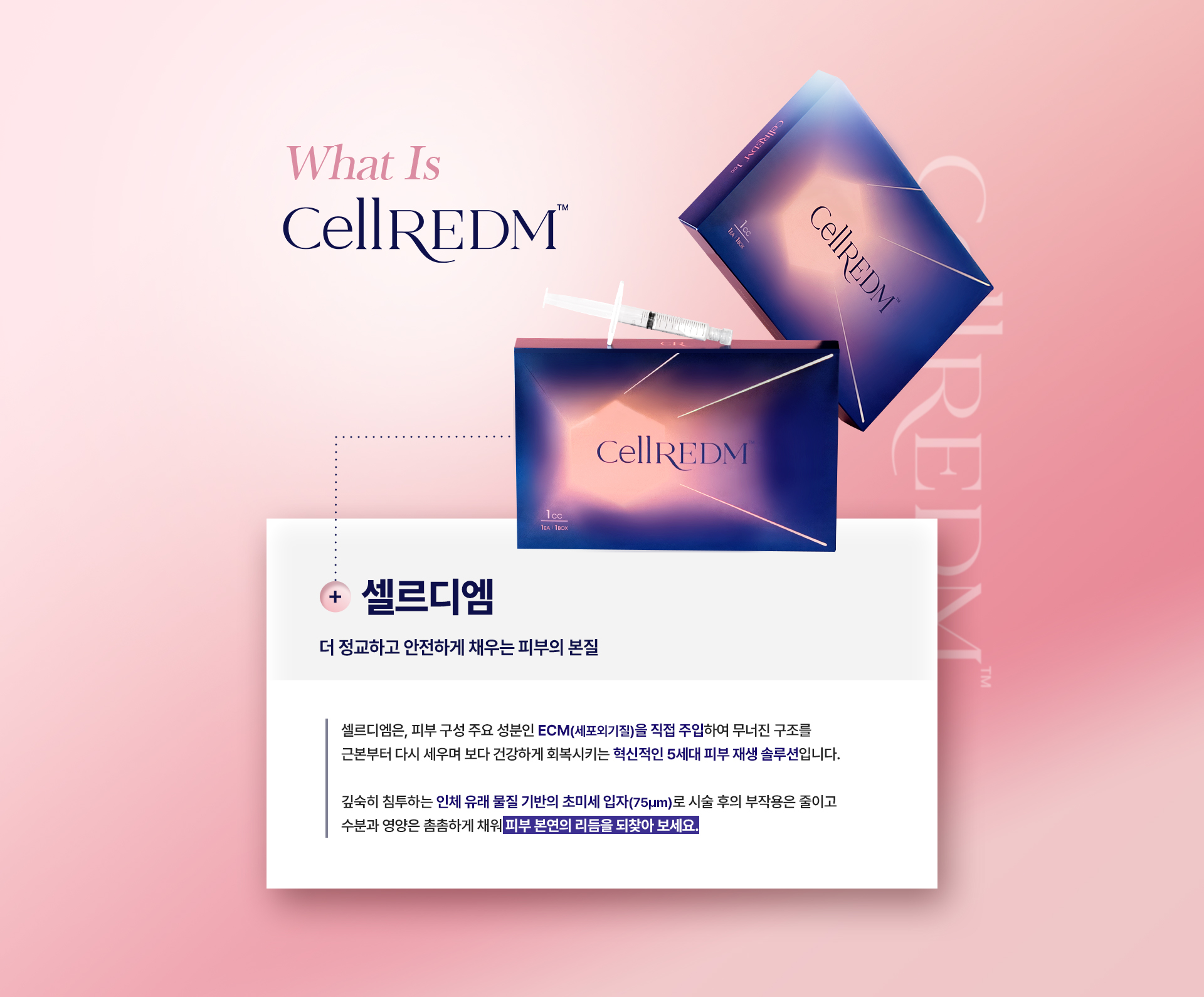 셀르디엠은, 피부 구성 주요 성분인 ECM(세포외기질)을 직접 주입하여 무너진 구조를 근본부터 다시 세우며 보다 건강하게 회복시키는 혁신적인 5세대 피부 재생 솔루션입니다.